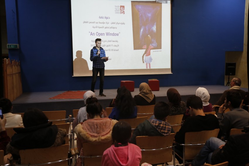 نظّم مركز الطفل-غزة/مؤسسة عبد المحسن القطان، يوم الأربعاء 11 كانون الأول/ديسمبر 2019، أمسية أدبية بعنوان (An Open Window) قدّمها أطفال نادي اللغة الإنجليزية، وذلك اختتاماً لنشاطات النادي خلال الدورة البرامجية لخريف 2019، التي نُفذت في الفترة بين (8 أيلول/سبتمبر حتى 11 كانون أول/ديسمبر 2019).