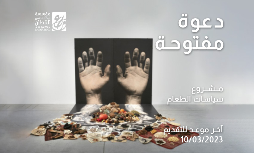 تدعو مؤسسة عبد المحسن القطان الفنانين والفنانات من مختلف الحقول البصرية لتقديم مقترحاتهم من أجل المشاركة في مشروع "سياسات الطعام"، الذي يهدف إلى التمعّن في سياسات الطعام، واستكشاف العلاقات المتداخلة والمرتبطة بإنتاجه، واستهلاكه، وتوزيعه، وعلاقته بدوائره السياسية، والاجتماعية، والاقتصادية، والجغرافية، وغيرها، وكذلك أثره على صياغة الهوية الجماعية والثقافة المجتمعية.