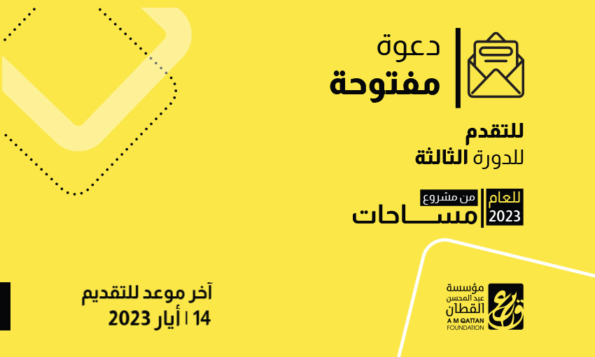 تعلن مؤسسة عبد المحسن القطَّان عن فتح باب التقدّم لدورة الصيف من مشروع "مساحات" للعام 2023، وتدعو الفنانين، والفرق، والمجموعات الفنية، والأدباء، والأكاديميين، والممارسين الثقافيين من مختلف حقول الفنون البصرية، والأدائية، والأدب، والسينما، وغيرها، إلى تقديم طلباتهم للمشاركة في المشروع.