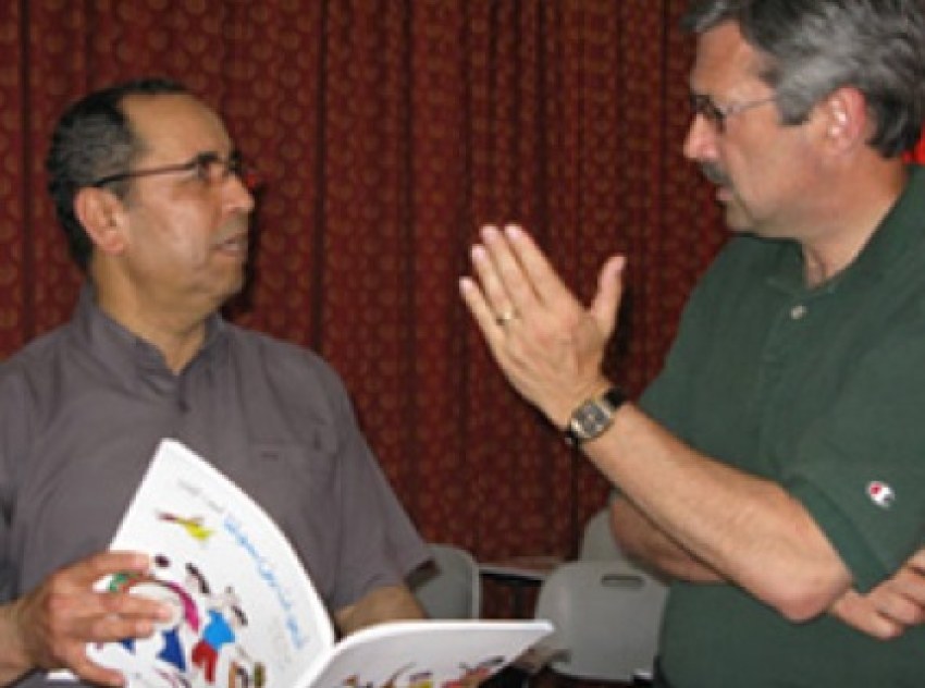 Bill Corcoran, President of ANEERA (right, with GMS Director Ibrahim Najjar) paid a visit to the new premises of the Gaza Music School where a group of students played for him and expressed their determination to pursue their education in spite of Israel's destruction of their original school.