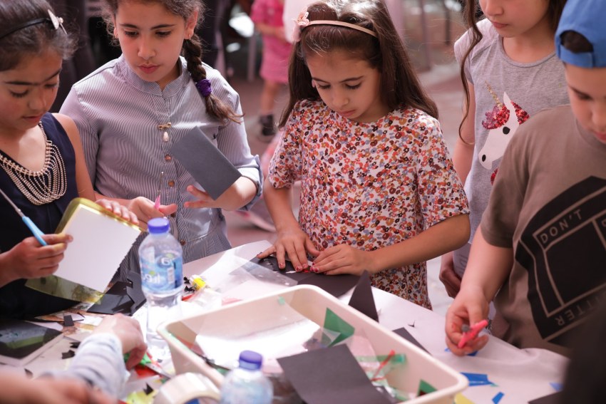 اختار الأطفالُ بحذرٍ المكان الأنسب لوضع شبابيك الجبص والفسيفساء التي صنعوها، هل يريدونها عند باب المغاربة؟ أم باب العامود؟ بنوا القدس الخاصّة بهم على جداريّةٍ تمثّل خارطة العاصمة، وذلك في فعاليّة "أطفالنا يبنونها"، إحدى فعاليّات مهرجان "نوّار نيسان" في البلدة القديمة برام الله، الجمعة 13/4/2018.