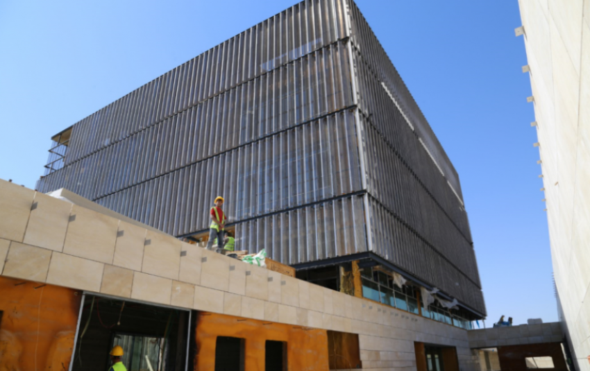 أما في الأجزاء الخارجية للمبنى، فيجري العمل على تثبيت ألواح الألمنيوم العمودية، وإنهاء تلبيس الحجر على الواجهة الشرقية للمبنى. ولا يزال العمل جارياً في تسوية الحدائق الخارجية والداخلية ومدخل الكراج.