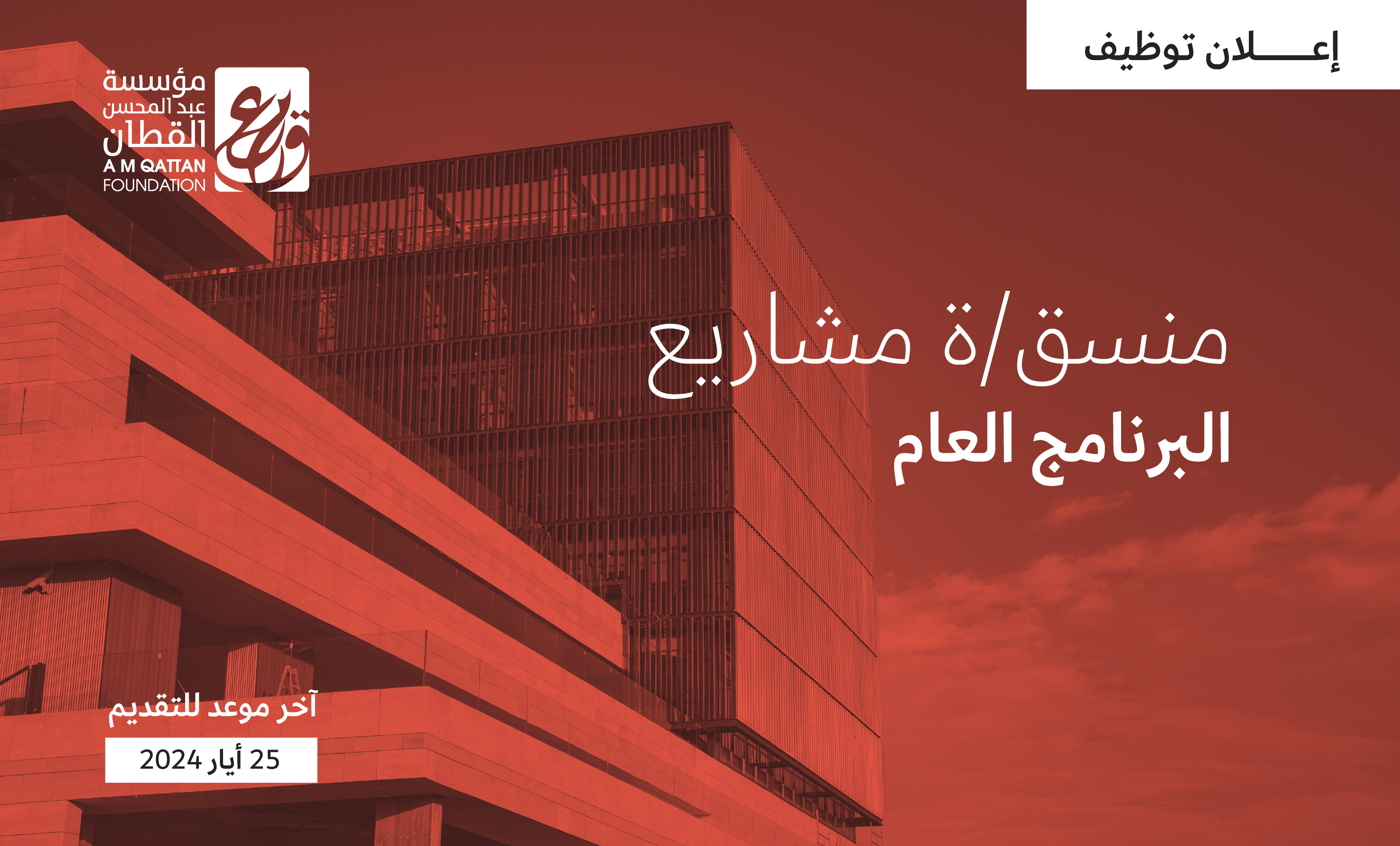 تعلن مؤسسة عبد المحسن القطَّان عن رغبتها في توظيف منسق/ة مشاريع، وحدة القيمية للعمل في مقر المؤسسة الرئيسي في رام الله. وفيما يلي تفاصيل هذه الوظيفة: