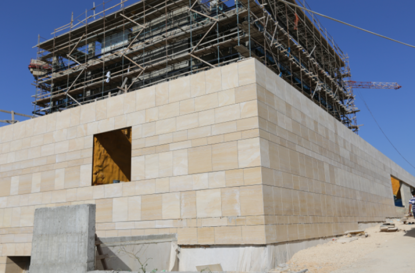 Work is underway on the external finishing of the new building of the A. M. Qattan Foundation (AMQF) in the Al-Tira neighbourhood, Ramallah. Aluminium beams were installed around the main building. Glass panels were fixed on the northern and southern facades. Work is underway to install stone slabs on outer walls and prepare the car entrance.